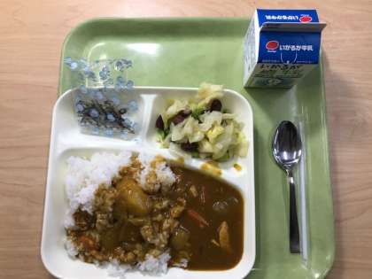 チキンカレーライス、ビーンズサラダ、ミニフィッシュです。