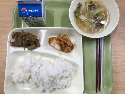 鶏肉のみそバターソース、五目汁、きんぴらごぼうです。