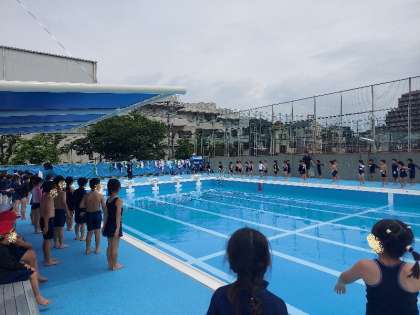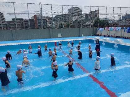 初めての小学校のプールに「めっちゃ大きい!」と驚きの声が上がりました。