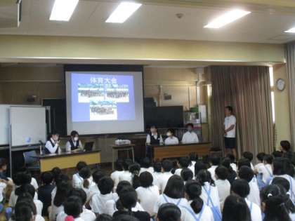 大領中学校の代表の生徒の皆さんが、大領小学校の6年生の児童に、学校紹介をしてくれました。中学校の行事や部活動などを教えてくれました。