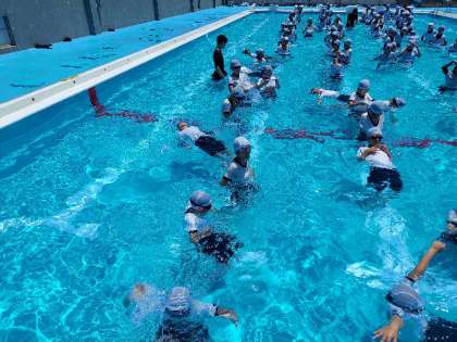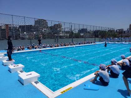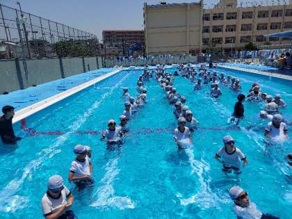 服(体操服)を着て水の中に入り、水着だけの時と比べて、動きにくさを実感しました。