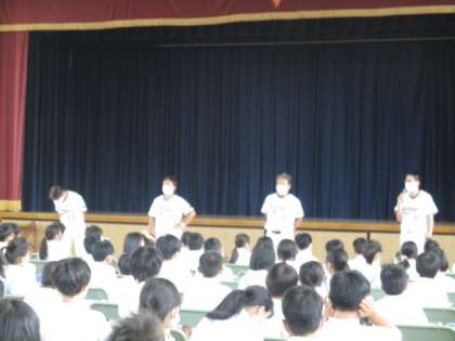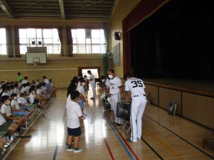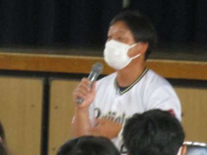 7月14日2時間目にオリックス元野球選手4名の方が来られ、あきらめず頑張る気持ちの大切さなど質問タイムをまじえながら講話していただきました。有名選手のサインボール(山本由伸選手や森友哉選手など)やサイン色紙、トートバッグのプレゼントもいただきました。