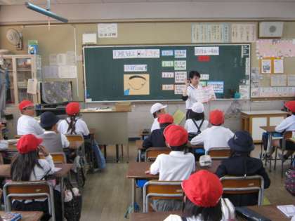 10月6日3時間目、4年3組で「目の愛護デー」に関する授業がありました。授業をしたのは西口先生。先生は保健室の先生になるために教育実習に来ています。目に関するクイズに赤白帽の色で解答する楽しい授業でした。
