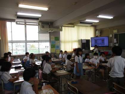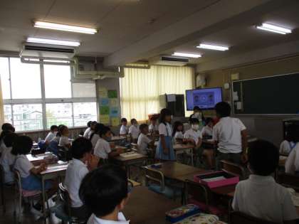 1人が英語で好きな色や好きな果物などを質問し、もう1人の子が英語で答えていました。