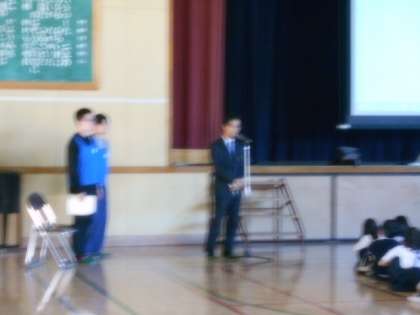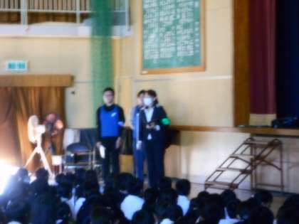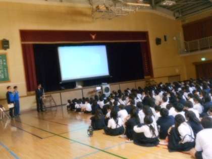 スマホを使うときに気をつけてほしいことを大学生二人から講話してもらいました。「ゲームの課金」や「なりきりメール」などちょっと怖い話もありました。子どもたちも将来気をつけなければならないと感じたと思います。大阪府警の方と住吉警察の方にも話をしてもらいました。