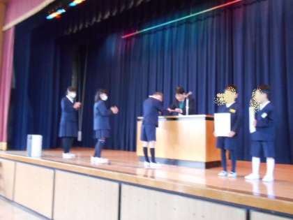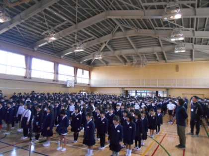 久しぶりに全校児童集まりました。気持ち新たに頑張ろう。転入生3・5年生2名の紹介、読書感想文の表彰もありました。