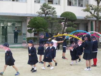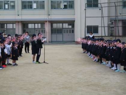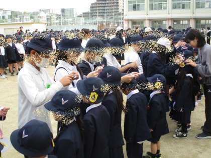 アーチをくぐる1年生を大きな拍手で迎えました。1年生はちょっと緊張している面持ちでした。大きなメダルを6年生から受け取ってうれしかったでしょうね。