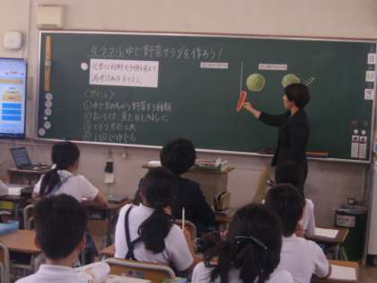 5年生は、家庭科「クッキング はじめの一歩 〜カラフルゆで野菜サラダを作ろう〜」の研究授業を行いました。