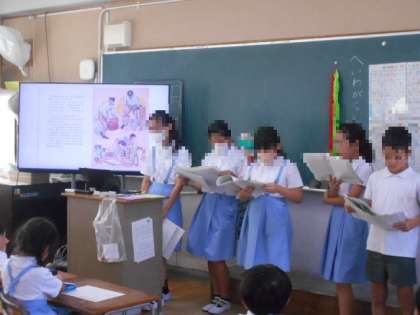 チームスで全校児童に平和の願い・歴史などの説明の後、6年生による平和関連の絵本読み聞かせ、その後、折り鶴をそれぞれの学級で折りました。折り鶴の作り方を教えに6年生が1年生を、5年生が2年生を担当しました。