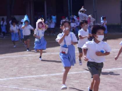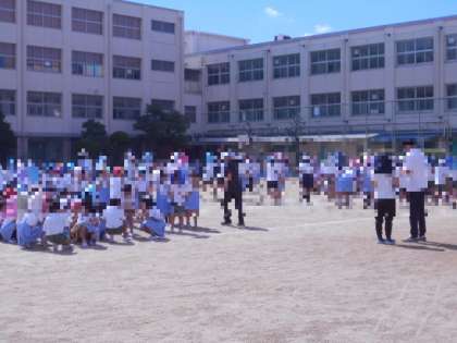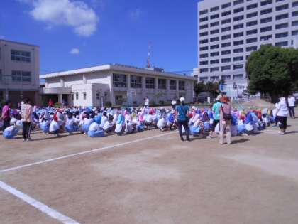 家庭科室から火が出たことを想定しての避難訓練がありました。家庭科室から離れた場所の大領の森側運動場に避難しました。4分50秒で避難完了できました。