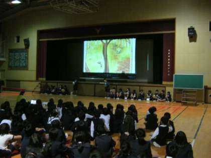 12月3日の児童集会は図書委員会の発表でした。委員会の子どもたちは「まいごのどんぐり」(松成真理子・作)という絵本を読み聞かせてくれました。今の季節にぴったりのお話で、大領小学校の大きな「くすのき」を思い浮かべながら聞きました。