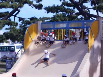 広い滑り台では、5人ぐらいが一緒に滑っていました。帰りの電車での様子は、みんなバテバテでした。疲れたけど楽しかったのではと思います。