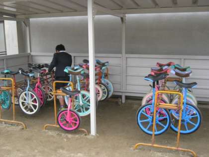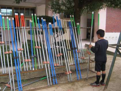 12月15日、12月とは思えないほど暖かな日。昼休みには、たくさんの子どもたちが運動場に出て、思い思いの遊びを楽しんでいます。チャイムが鳴ると掃除の時間です。子どもたちはそれぞれの掃除場所へ急ぎます。しかし、一輪車や竹馬を黙々と整理する子が・・・。運動委員会が当番を決めていつもきれいに整理してくれています。