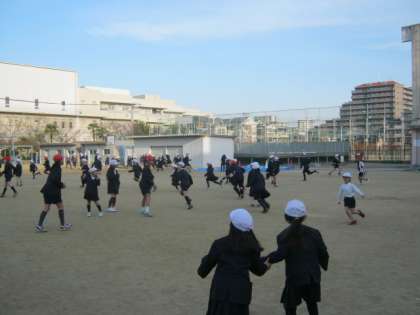 1月21日の児童集会は、各学年の2組の子どもたちが運動場に集まって、「こおりおに」をしました。寒さに負けずに運動場を走りました。