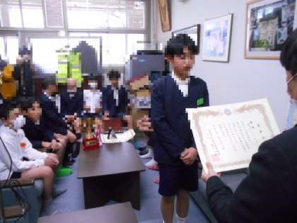 児童朝会で野球チーム 住吉フェニックスの全国大会出場の表彰がありました。表彰式に部員たちもかけつけました。全国大会に行けるのがすごい!みんないい笑顔でした。