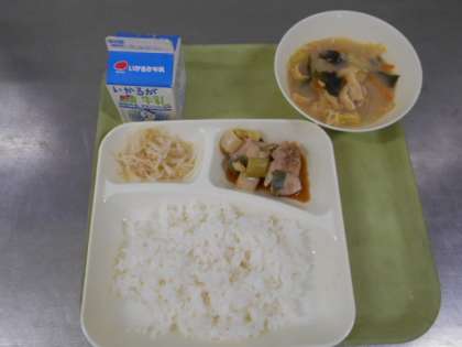 今日の献立は、焼きとり みそ汁 もやしのゆずの香あえ ご飯 牛乳です。