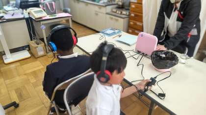 ヘッドホンを着用し、音がなっている間はボタンを押します。保健室でお友だちが検査を受けているときも、とても静かに待てていました。素晴らしいですね。