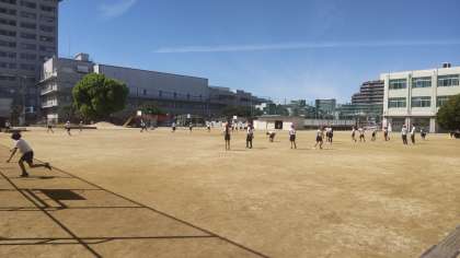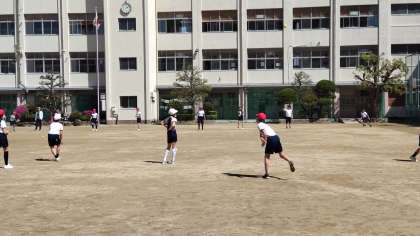 運動場で、体力テストに向けて遠投の練習をしていました。先生から、真っ直ぐに投げるコツを教えてもらっていました。