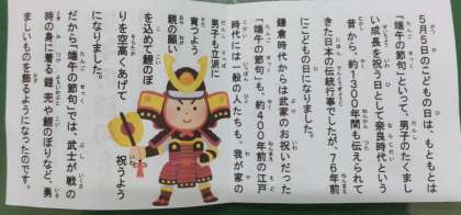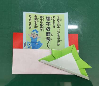 今日は、地域の方が見守り活動をしながら、5月5日のこどもの日の由来や昔からの風習を分かりやすく書かれたミニパンフレットと折り紙の兜のプレゼントをしてくださっていました。学校の玄関にも掲示しています。学校に来られた時はご覧くださいね。