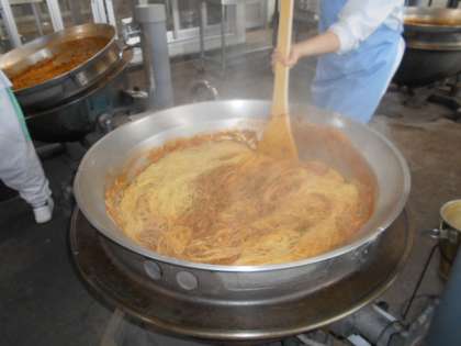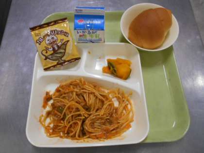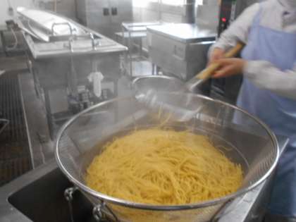今日の献立は、児童に好評なミートソーススパゲッティです。スパゲッティは、乾麵をゆでて作ります。ひき肉の入ったソースとからめて仕上げます。