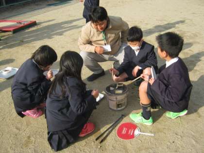 2月4日、3年生は社会科の学習で昔のくらしを体験するために、七輪でお餅を焼きました。保護者のみなさんにも手伝っていただき、上手に焼きました。できたお餅はおいしくいただきました。