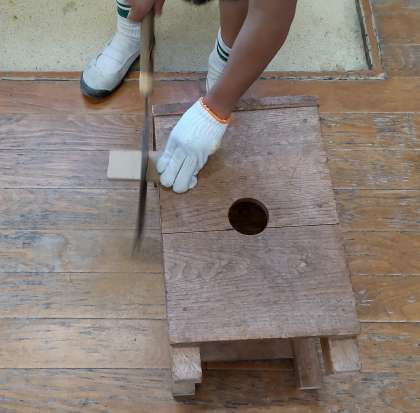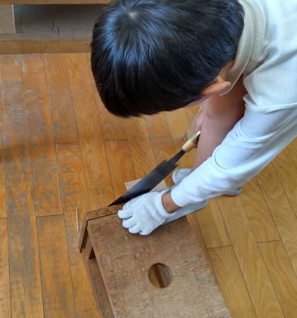 初めてのノコギリを使っての学習です。ノコギリをひく方向や力の入れ方、ノコギリと板との角度など、使い慣れない道具に悪戦苦闘する人も。どんな、作品が出来るか楽しみです。