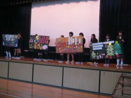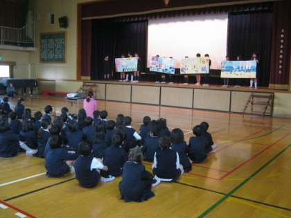 2月5日の児童集会は掲示委員会の発表でした。毎月の玄関掲示を作ってくれているのが掲示委員会です。今までの作品を紹介してくれたり、クイズを出題してくれたりしました。