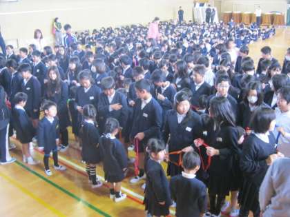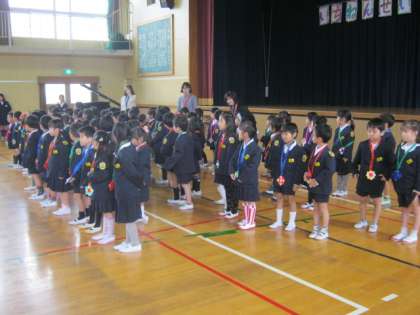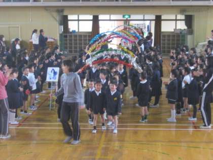 4月11日、1時間目に「1年生を迎える会」を行いました。アーチをくぐって入場した1年生は、「よろしくお願いします」と、あいさつしました。児童会の代表が歓迎の言葉を述べ、6年生からは手作りのメダルのプレゼントがありました。2〜6年生のみなさんは、いろいろ教えてあげてくださいね。