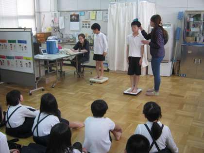 昨日から発育測定がはじまりました。今日4月13日は5年生でした。保健室の先生から健康診断についてのお話を聞いたあと、身長と体重を測りました。