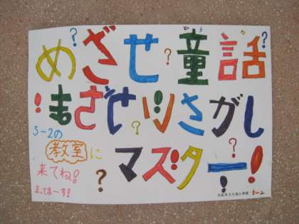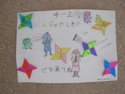 5月21日の土曜授業は「大領祭」です。子どもたちはみんな楽しみにしています。5月11日、職員室前の廊下には各学級のポスターが並んでいます。どのお店も楽しそうです。