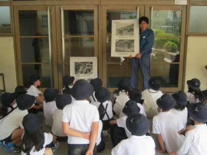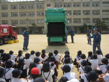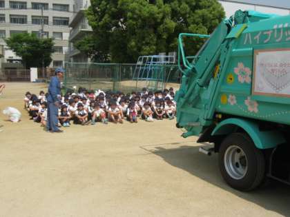 5月23日2時間目、大阪市西南環境事業センターのみなさんに来ていただき、4年生はパッカー車体験をしました。ゴミ収集の歴史についてお話を聞きました。