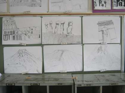 7月4日、5年生は「鉛筆で描こう」。身近な鉛筆やはさみを丁寧に描きました。6年生は「世界遺産」。自分で選んだ世界遺産をサインペンの点描で表しています。