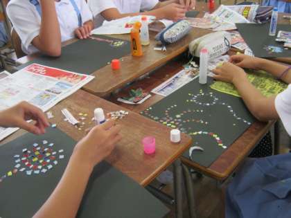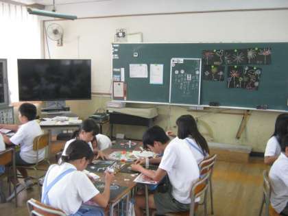 7月13日、2時間目、6年2組では図画工作科の時間に「花火」の切り絵の学習をしていました。チラシの色を上手に使いながら夏の夜空を表現しました。