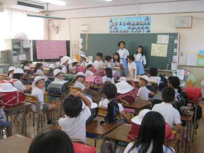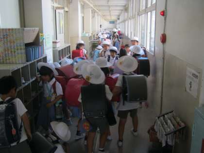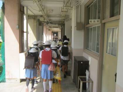 9月7日5時間目、台風が接近してきたという想定で、避難訓練を行いました。地区別の教室に集合したあと、集団下校をしました。