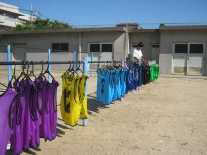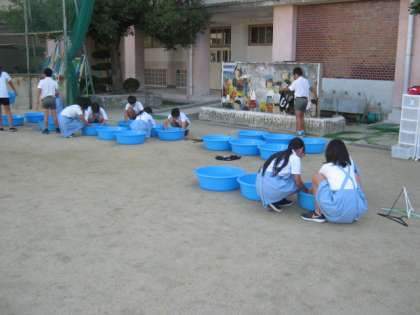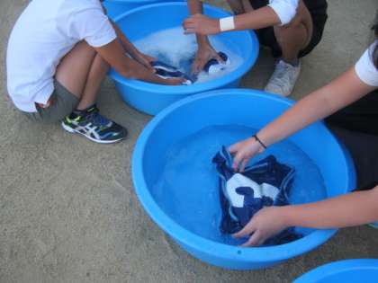 10月7日1時間目、6年3組は家庭科の学習で洗濯の実習をしました。運動会で使ったビブスを手洗いして鉄棒に干しました。