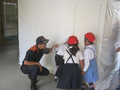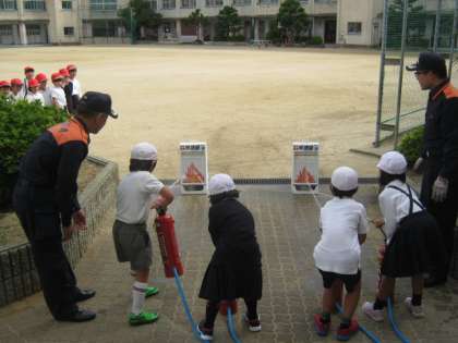 10月11日2時間目、住吉消防署のみなさんに来ていただき、2年生の防災訓練を行いました。多目的室でお話を聞いたあと、けむりハウスの体験と、水消火器で使い方の学習をしました。