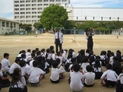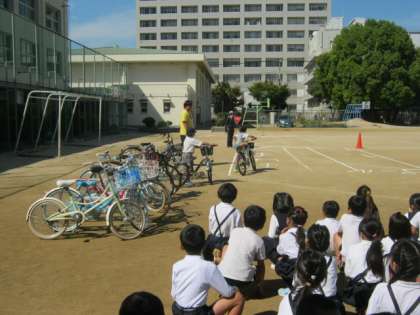 10月12日2・3・4時間目、1・3・5年生の交通安全教室を行いました。住吉警察署から2人のおまわりさんに来ていただき教えていただきました。1年生は正しい歩き方、3・5年生は安全な自転車の乗り方を学びました。おうちに帰ったら今日学んだことを生かし、事故にあわないよう気をつけましょう。