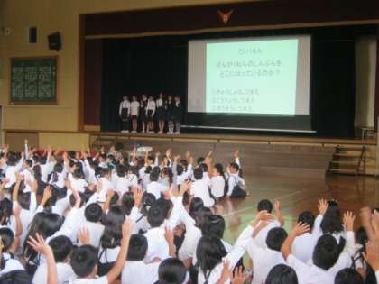 10月20日の児童集会は新聞委員会の発表でした。新聞ができるまでの様子を詳しく発表したり、3択クイズを出題したりしてくれました。