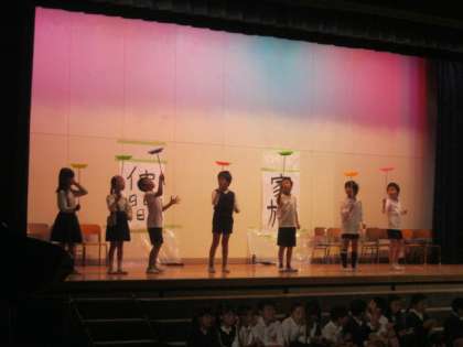 3年生は総合の発表で「さらまわし」や「中国ごま」、書写や「虹のかなたに」のリコーダー合奏と盛りだくさんの内容でした。