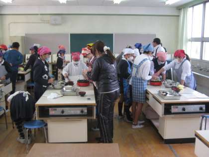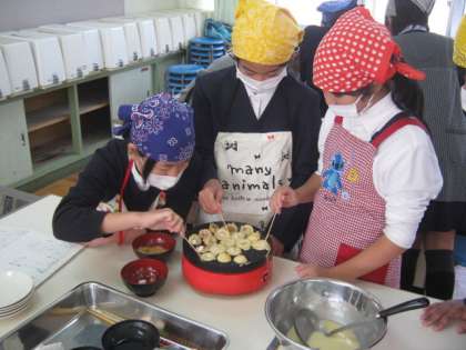 11月30日2・3時間目、6年1組は家庭科の調理実習で「たこ焼き」を作りました。お店で作るのを見ていたり、家庭で作ったりした経験があるのでしょう。みんな上手に作っていました。さすが大阪の子です。