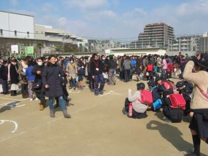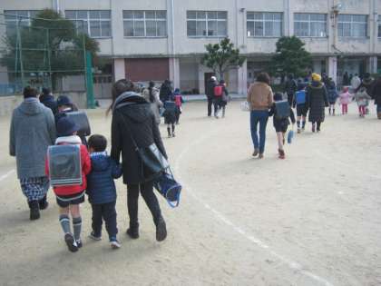 避難訓練に続いて保護者のみなさんへの引き渡し訓練を行いました。保護者の方が迎えにこられなかった子は、地区別に分かれて集団下校しました。