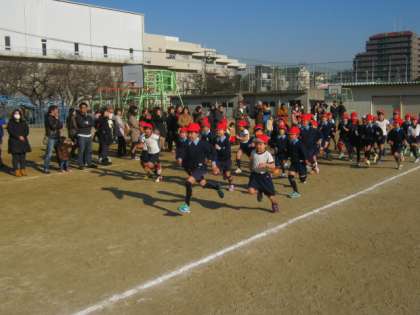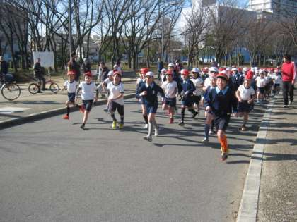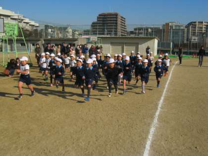2月4日、運動場と長居公園で持久走記録会を行いました。1・2年生は運動場を、3〜6年生は長居公園を走りました。
