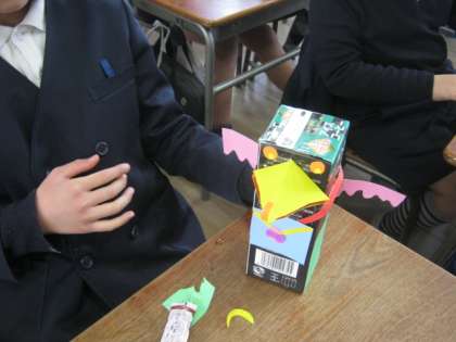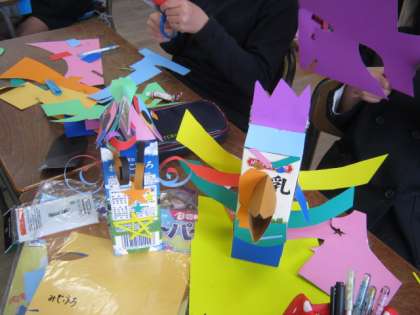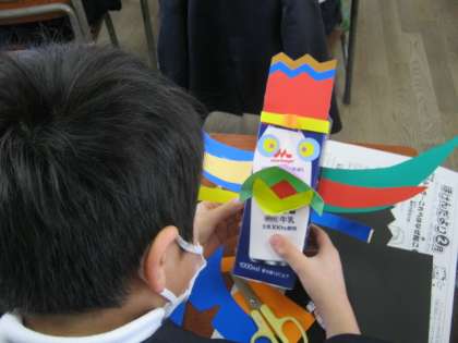 2月6日1時間目、3年1組は図工で「彩とりドリ〜カラフルBird」を作っていました。牛乳パックに色画用紙をつけて個性的な鳥に変身させます。出来上がりが楽しみです。