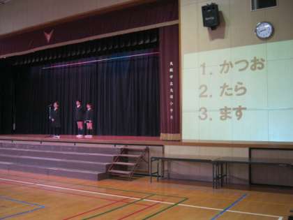 2月20日の児童集会は給食委員会の発表でした。クイズやアンケートの結果発表、給食調理員さんへのインタビューなど、工夫して発表してくれました。