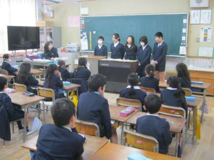 2月23日、朝の児童集会の時間に「6年生ありがとう会」を行いました。各教室にたてわり班で集まり、6年生に記念のよせがきを送りました。6年生からは下級生に感謝と励ましの言葉をかけました。