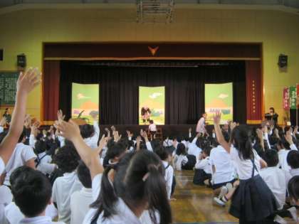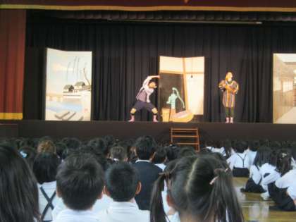5月13日(土)劇団コーロさんによる「天満のとらやん」を鑑賞しました。様々な楽器にあわせて話がすすんでいくと、子どもたちの楽しい気持ちもどんどん盛り上がっていきました。さらに、大根を抜く場面では、子どもたちも参加する機会があり、多くの子どもたちが「やりたい。」と手を挙げていました。こういった劇は日頃見る機会がないので、よい経験になりました。