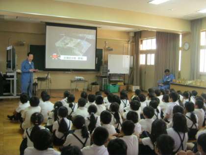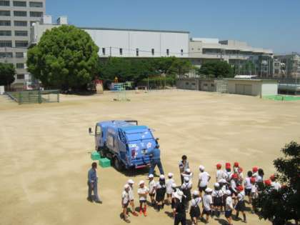 5月22日(月)4年生はパッカー車体験をしました。社会科で「すみよいくらしとごみ」の学習に取り組んでおり、その一環として出前授業を受けました。西南環境事業局の方に来ていただき、ごみの出し方や分別の仕方も教えてもらいました。