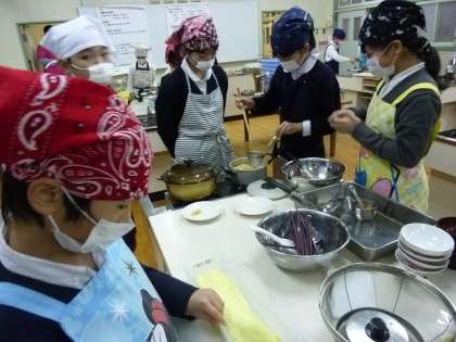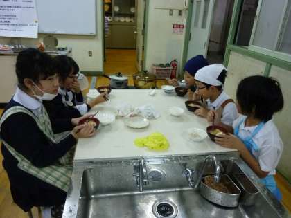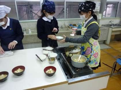 11月29日(水)5年1組は調理実習で、ご飯とお味噌汁を作りました。ご飯はガスで炊きました。上手におこげもできていて、おいしそうに炊き上がりました。お味噌汁は鰹節でだしを取り、具に大根や豆腐、白ネギなどを入れました。