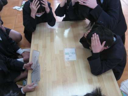 この時期は、大領小学校恒例のカルタ大会があります。学年ごとに20分休みに集合して熱戦が繰り広げられます。よく見てください。カルタが手作りなのが分かりますか?これは実は児童会の手作りです。学校生活にちなんだ文章になっています。カルタ取りも楽しいですが、読まれる文章も盛り上がりの秘訣です。さあ頭に手をおいて・・・・・・・