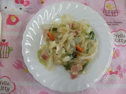 にんじん、ピーマン、たまねぎ、キャベツ、ベーコンで野菜炒めを作りました。